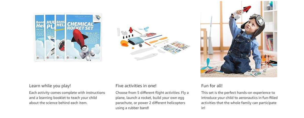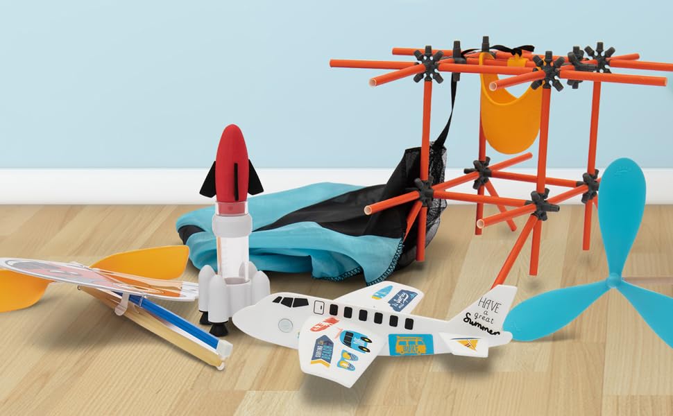 The PlaySTEM Aero Science Combo Set is the perfect activity for students to learn about different methods of flight. Fly a plane, launch a rocket, build your own egg parachute, or power two different helicopters using a rubber band. Each activity comes complete with instructions and a learning booklet to teach users about the science behind each item. Try out each activity on your own or share with friends!