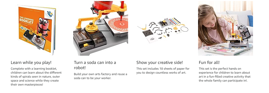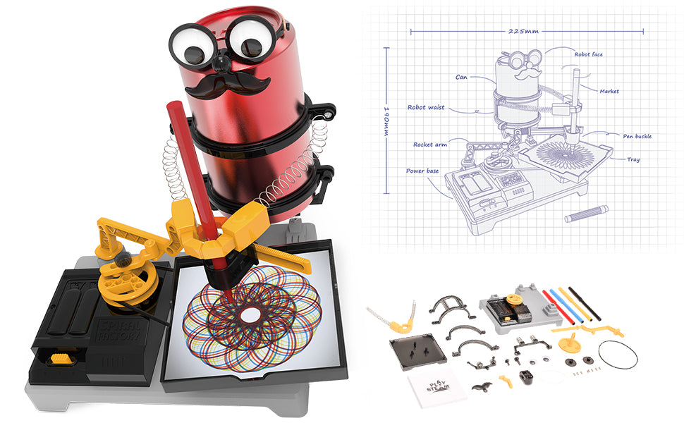 The PlaySTEM Arts Robot Spiral Factory is the perfect activity for creative students. Build an arts factory using a conveyor belt, power base, paper and more. Reuse a tin can and transform it into a robot. Using markers, watch your robot go to work and create colorful designs. Complete with a learning booklet, read about the different kinds of spirals seen in nature, outer space and science!