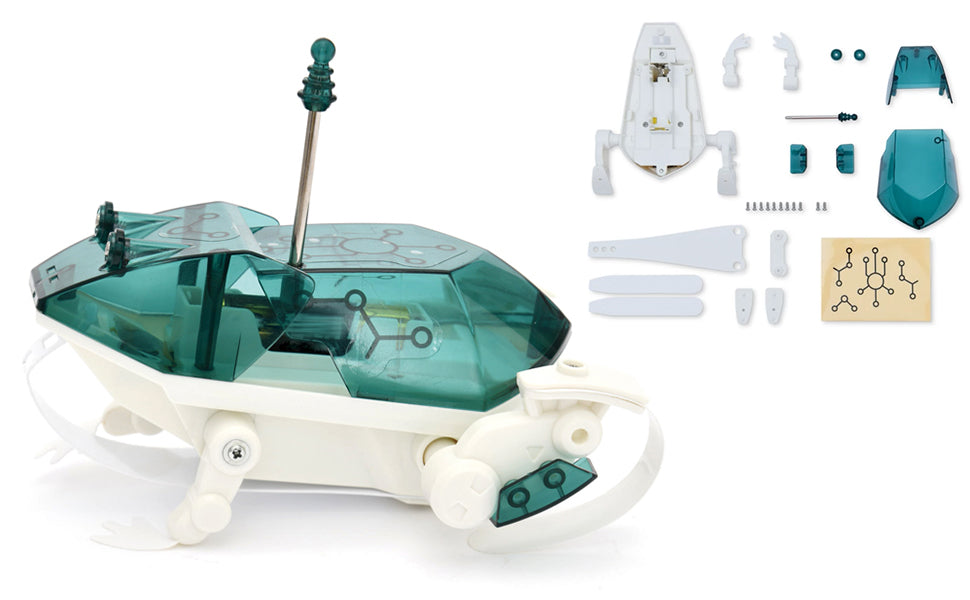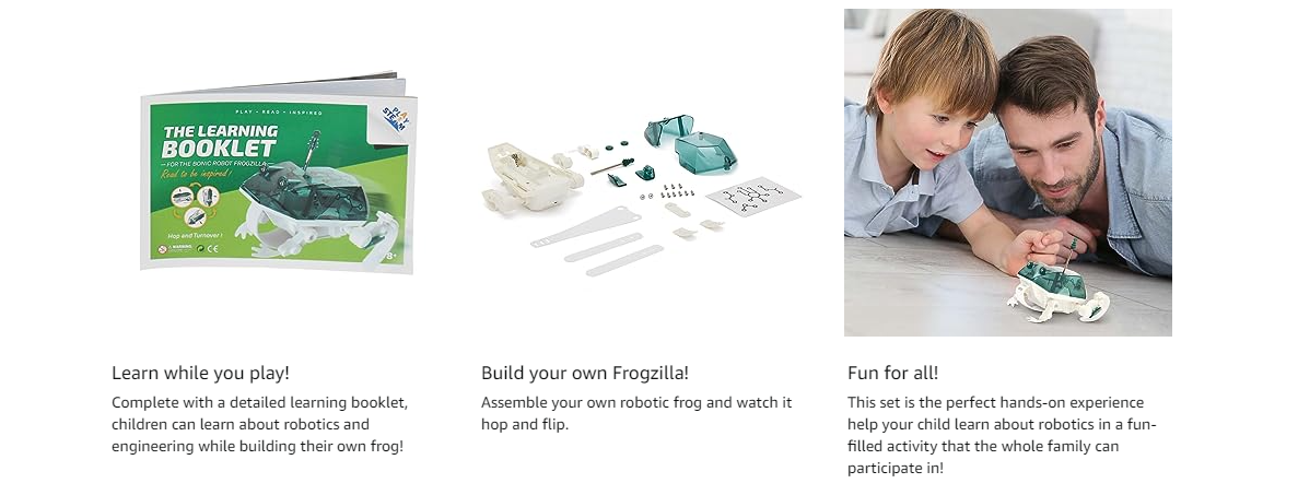 Assemble a frog specially designed with robotic legs. Watch the frog hop around and conquer any obstacle. Made from polymer, the shape of the legs allows the frog to keep going. Complete with a Learning Booklet, learn fun facts about poisonous frogs.