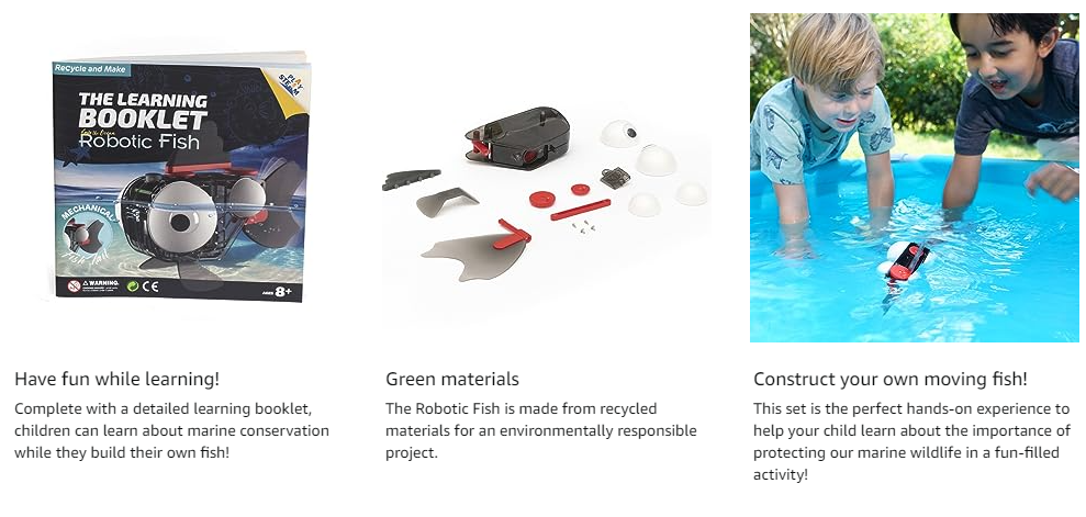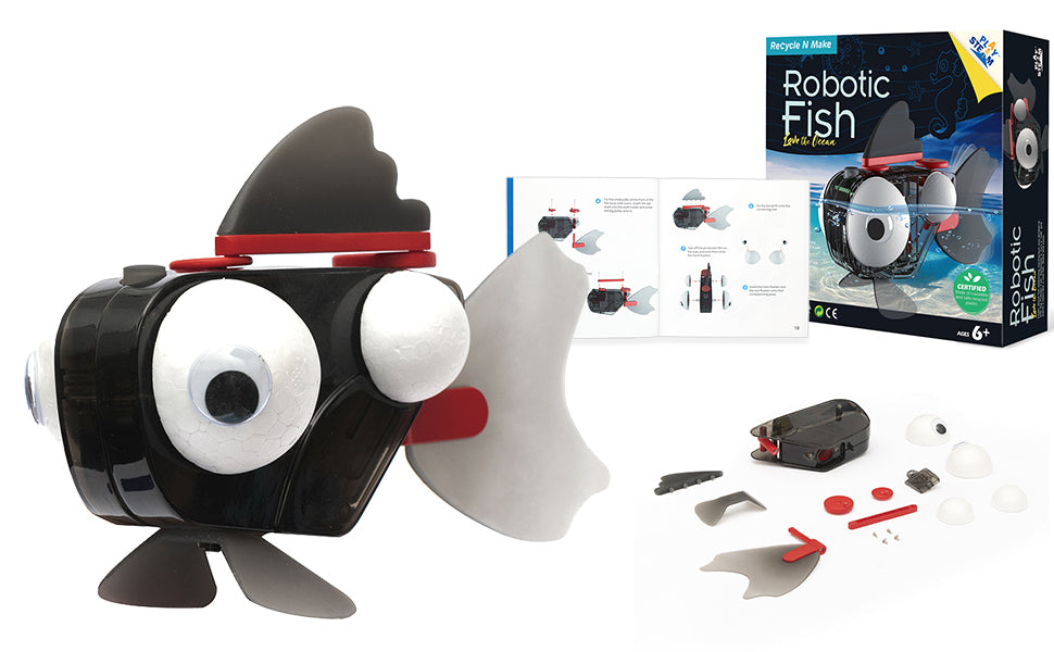 Made from recycled materials, the PlaySTEM Robotic Fish teaches about ocean conservation. Part of the Love the Ocean Series, children will learn about the importance of protecting our marine wildlife. Watch this fish come to life when it flaps its fins in the water.