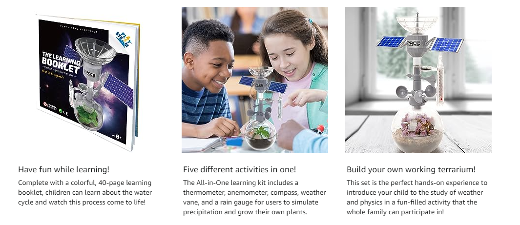 The Space Weather Station by PlaySTEM is the perfect activity for STEM students to learn while having fun. The All-in-One learning kit includes a thermometer, anemometer, compass, weather vane and a rain gauge for users to stimulate precipitation and grow their own plants. Complete with a colorful, 40-page learning booklet, children can learn about the water cycle and watch this process come to life!