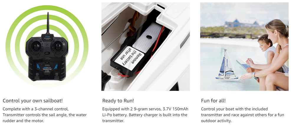 This is an easy to use product with no assembly required. Complete with a wire transmitter, control your boat and race against others.