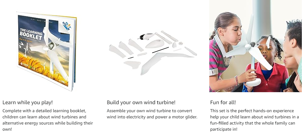 The PlaySTEAM Wind Powered Motor Glider teaches students about wind turbine electricity. This set includes a wind vane, propeller, rotor blades and generator to resemble a real-life wind turbine.